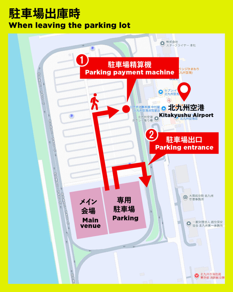 北九州空港駐車場入口から、係員の指示に沿って大会専用駐車場までお入りください。